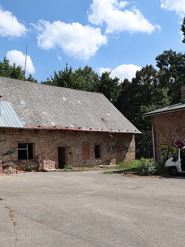 Práce na opravě zchátralých objektů zámecké konírny a mléčnice v Parku Boženy Němcové v Karviné začaly. (19. srpna 2025)