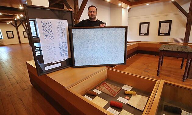 Vedoucí muzea Fojtství v Kopřivnici Ondřej Šalek ukazuje panely se vzory malířských válečků se sbírky Ondřeje Matuly.