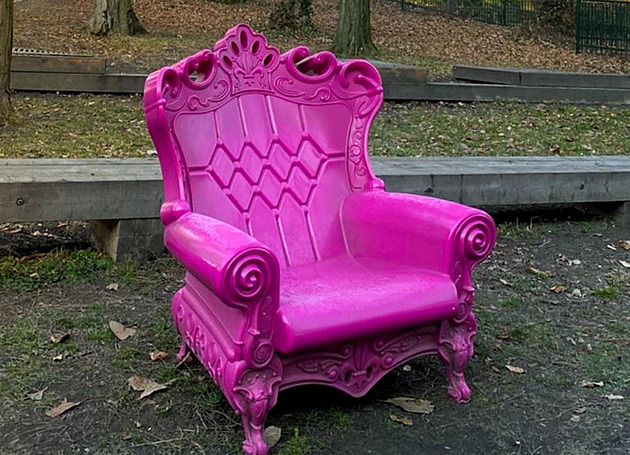 Růžové křeslo pojmenovali Královna lásky, váží asi dvacet kilogramů a od roku 2011 stálo v parku pod Piastovskou věží v polském Těšíně.