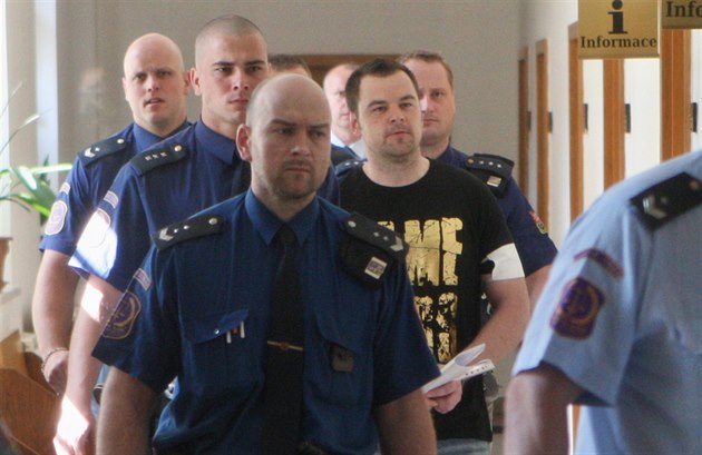 Eskorta přivádí Petra Kramného k Okresnímu soudu v Karviné, kde se rozhodovalo o jeho setrvání ve vazbě. (26. května 2014)