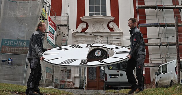 Daniel (vlevo) a Jakub Macháčovi z Rýmařova s ciferníkem, který vyrobili ve své rodinné firmě. Zamířil na věž poutního kostela Povýšení svatého Kříže a Panny Marie Sedmibolestné na krnovském vrchu Cvilín. (11. prosince 2025)