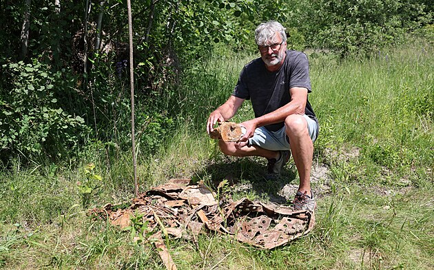 Pyrotechnik Ivo Peterek s vykopanými zbytky munice od stezek Kabátova kopce u Krnova. Nalezený materiál si nakonec odveze policie. (13. června 2025)