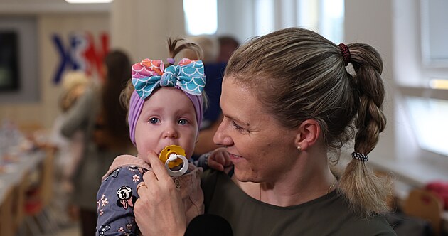 Krnovská porodnice přivítala děti, které se v ní před rokem narodily v provizorních podmínkách během povodní. Jednou z nich byla malá Stella s maminkou Gabrielou Závodskou. (16. 9. 2025).
