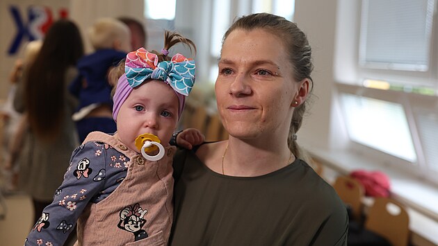 Krnovská porodnice přivítala děti, které se v ní před rokem narodily v provizorních podmínkách během povodní. Jednou z nich byla malá Stella s maminkou Gabrielou Závodskou. (16. 9. 2025).