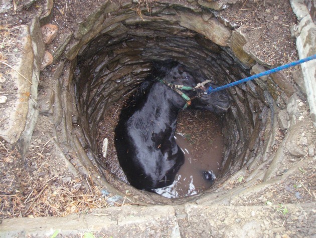 Dospělý kůň vážící okolo šesti set kilo v úzké kamenné studni napůl stál a napůl ležel zkroucený. Od utopení jej zachránily pouze dřevěné trámy ve vodě, o které byl zapřený.