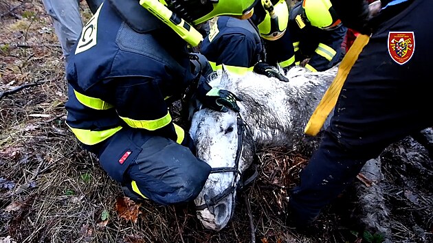 Kůň uvázl v lesní bažině bažině. Pomohli hasiči