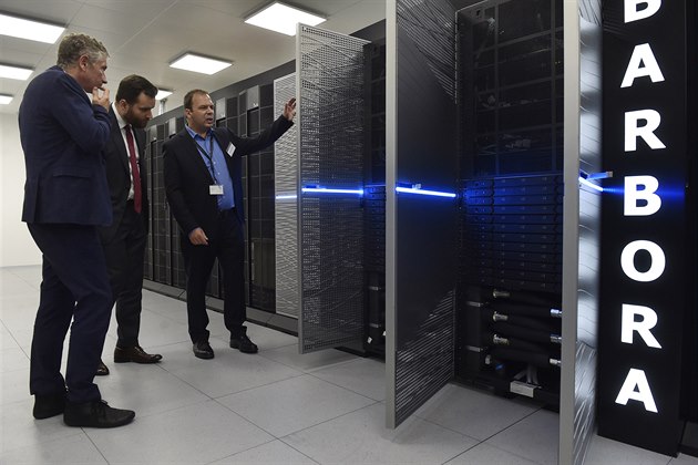 U nového ostravského superpočítače stojí (zleva) hejtman Moravskoslezského kraje Ivo Vondrák, náměstek ministra školství pro řízení sekce vysokého školství, vědy a výzkumu Pavel Doleček a ředitel superpočítačové služby centra Branislav Jansík.