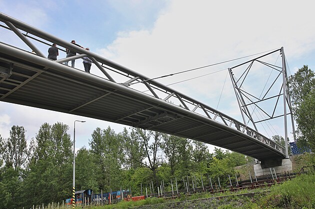 Lávka přemosťuje železniční vlečku a řeku Ostravici. (9. června 2023)