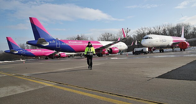 Odstavená letadla společnosti Wizz Air na mošnovském letišti u Ostravy. Stroje potřebují opravy motorů. (23. ledna 2024)