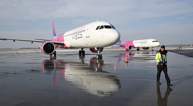 Odstavená letadla společnosti Wizz Air na mošnovském letišti u Ostravy. Stroje potřebují opravy motorů. (23. ledna 2024)