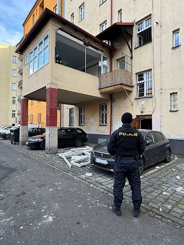 Policista před domem, kde v Ostravě explodovala bateriová koloběžka. (28. ledna 2025)