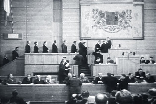 Demise nekomunistických ministrů na záběru z amerického filmového týdeníku „The March of Time“ (25. února 1948)