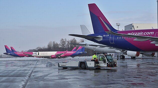 Odstavená letadla společnosti Wizz Air na mošnovském letišti u Ostravy. Stroje potřebují opravy motorů. (23. ledna 2024)