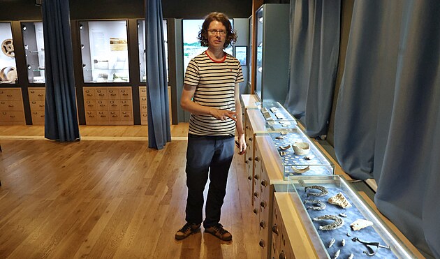 Středověký poklad, šuplíky s překvapení nebo barokní mapu s plány na kanál Dunaj–Odra–Labe uvidí návštěvníci v nové expozici, kterou Muzeum Oderska v Odrách zpřístupnilo lidem. (26. červen 2025) Na smímku historik Adam Hubáček