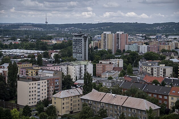 Pohled ze střechy socialistického mrakodrapu na Ostrčilově ulici v centru Ostravy. (17. července 2025)