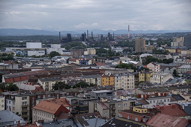 Pohled ze střechy socialistického mrakodrapu na Ostrčilově ulici v centru Ostravy. (17. července 2025)