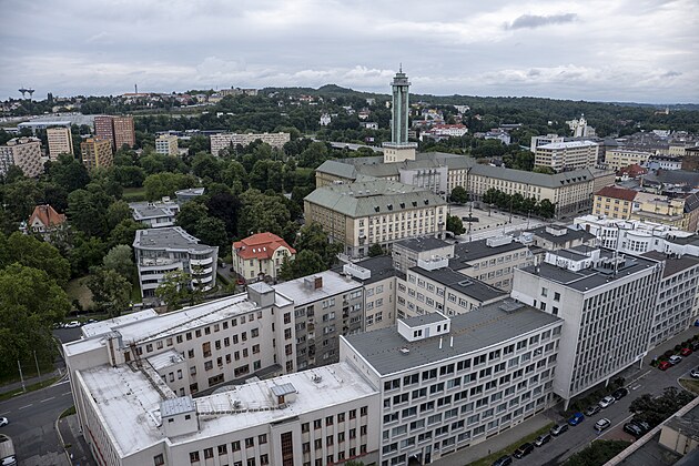 Pohled ze střechy socialistického mrakodrapu na Ostrčilově ulici v centru Ostravy. (17. července 2025)
