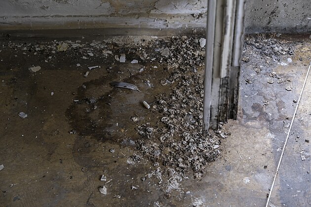 Stav útrob socialistického mrakodrapu na Ostrčilově ulici v centru Ostravy zůstává značně neutěšený. (17. července 2025)