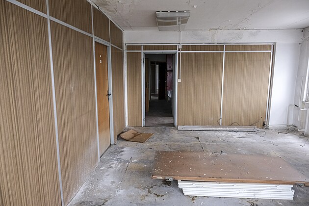 Stav útrob socialistického mrakodrapu na Ostrčilově ulici v centru Ostravy zůstává značně neutěšený. (17. července 2025)