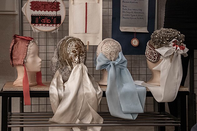 Ukázky různých čepců, součástí krojů, na prezentaci knihy Putování za krásou o díle Jiřiny Králové (15. února 2025)