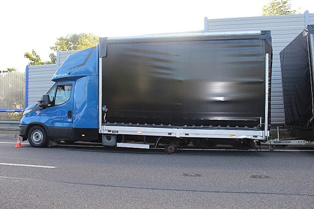 Upadlé kolo nákladní soupravy trefilo u Návsí čelní sklo protijedoucího vozu.
