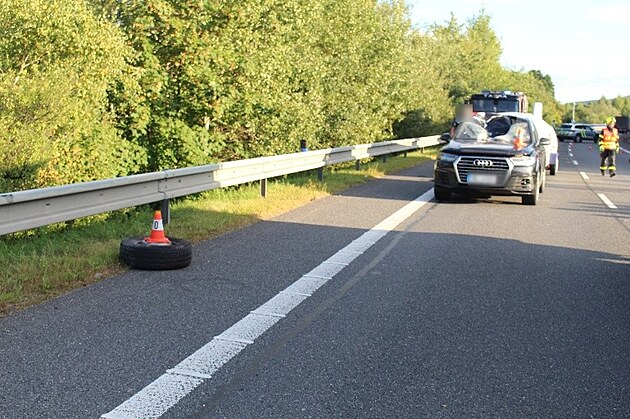 Upadlé kolo nákladní soupravy trefilo u Návsí čelní sklo protijedoucího vozu.
