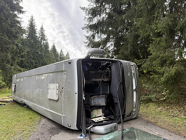 Ve Starých Hamrech v Beskydech zasahují policisté, hasiči i záchranáři u převráceného autobusu se studenty (8. září 2025).