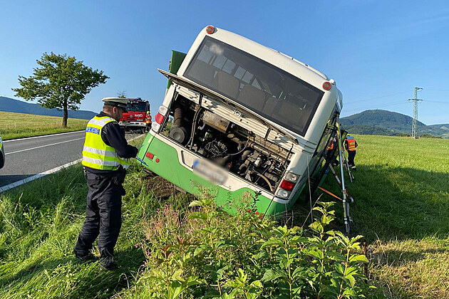 Zásah záchranářů, hasičů a policie u havarovaného autobusu na Novojičínsku, jeho řidič dostal infarkt. (7. srpna 2025)