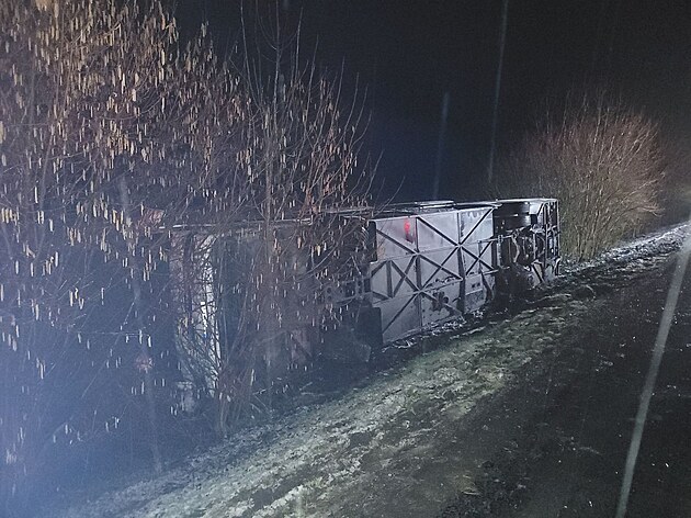 Autobus po nehodě skončil na boku v příkopu. Zranilo se devět lidí včetně dětí. (14 března 2025)