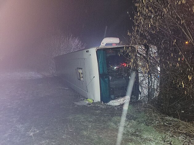 Autobus po nehodě skončil na boku v příkopu. Zranilo se devět lidí včetně dětí. (14 března 2025)