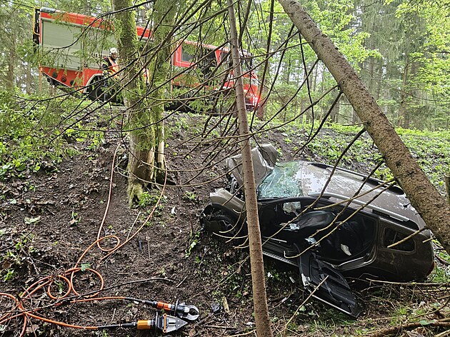 Nehoda vozu Dacia v katastru obce Bílá na Frýdecko-Místecku. Navzdory těžkým zraněním si řidička dokázala sama přivolat pomoc. (22. května 2025)