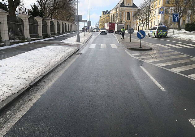 Místo nehody v Dukelské ulici v Bruntále, odkud řidič po střetu se školáky na přechodu pro chodce odjel. (17. března 2025)
