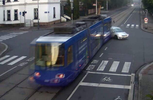 Kamerový záznam střetu tramvaje s automobilem na křižovatce ulic Ruská a Výstavní v Ostravě - Vítkovicích. (3. června 2025)