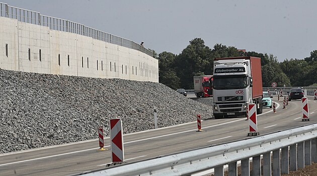 Obchvat Frýdku-Místku nedlouho před otevřením dalších dvou pruhů. Vlevo zpevňující zeď postavená kvůli sesuvu svahu. (24. července 2023)