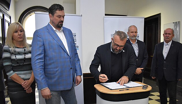 Primátor Frýdku Místku Petr Korč (Naše město FM) podepisuje koaliční smlouvu, vlevo od něj Radovan Hořínek (ANO). Za nimi zleva: nová náměstkyně Leona Sárkőziová (ANO), náměstek Jiří Kajzar (Naše město FM) a radní Zbyněk Šostý (Naše město FM). (27. září 2022)