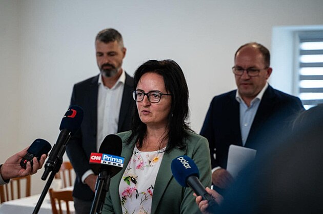 S aktuální situací ohledně výstavby přehrady Nové Heřminovy seznámil ministr Marek Výborný. Na snímku starostka Michaela Hermanová (16. 9. 2025).