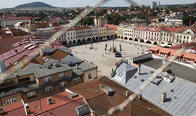Pohled z ochozu kostelní věže na Nový Jičín s mimořádným Masarykovým náměstím. Pletivo je kvůli bezpečnosti návštěvníků věže nutné. (30. srpna 2025)