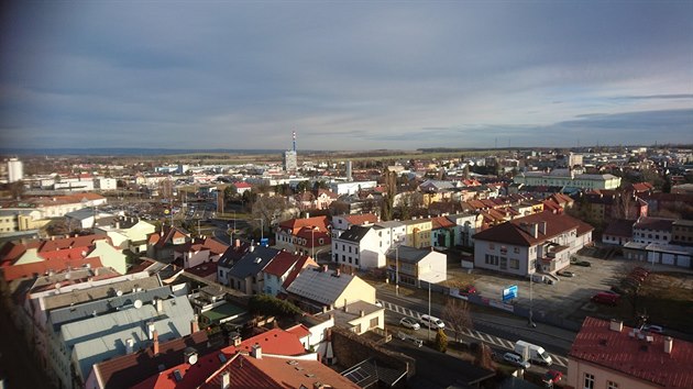 Pohled z ochozu kostelní věže na Nový Jičín v severovýchodním směru, v pozadí komín a výšková administrativní budova firmy Varroc Lighting Systems, dříve Autopal.