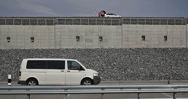 Obchvat Frýdku-Místku nedlouho před otevřením dalších dvou pruhů. Vzadu zpevňující zeď postavená kvůli sesuvu svahu. (24. července 2023)