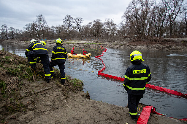 Hasiči postavili norné stěny kvůli úhynu ryb na řece Odře.