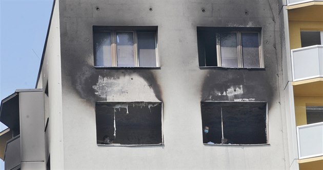 Okna vyhořelého bytu panelového domu v Bohumíně, kde při požáru zahynulo 11 lidí. Policejní a požární vyšetřovatelé byli na místě i druhý den po požáru. (9. srpna 2020)