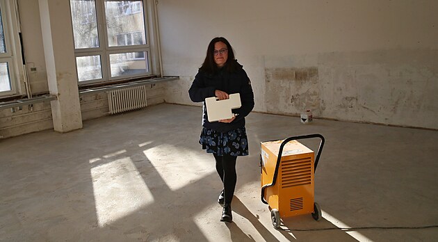 Ředitelka Knihovny Petra Bezruče v Opavě – Kateřinkách Markéta Beyerová v zatím prázdných a vysušovaných prostorách. Chystá se však velká popovodňová modernizace zařízení. (22. ledna 2025)