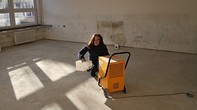 Ředitelka Knihovny Petra Bezruče v Opavě – Kateřinkách Markéta Beyerová v zatím prázdných a vysušovaných prostorách. Chystá se však velká popovodňová modernizace zařízení. (22. ledna 2025)