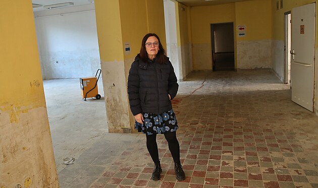 Ředitelka Knihovny Petra Bezruče v Opavě – Kateřinkách Markéta Beyerová v zatím prázdných a vysušovaných prostorách. Chystá se však velká popovodňová modernizace zařízení. (22. ledna 2025)