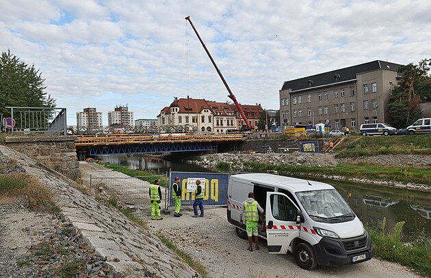 Stavbaři dokončují konstrukci klíčového mostu v opavské Ratibořské ulici, kde povodeň zničila ten původní (25. srpna 2025).