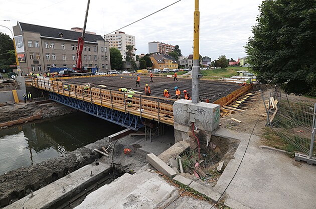 Stavbaři dokončují konstrukci klíčového mostu v opavské Ratibořské ulici, kde povodeň zničila ten původní (25. srpna 2025).
