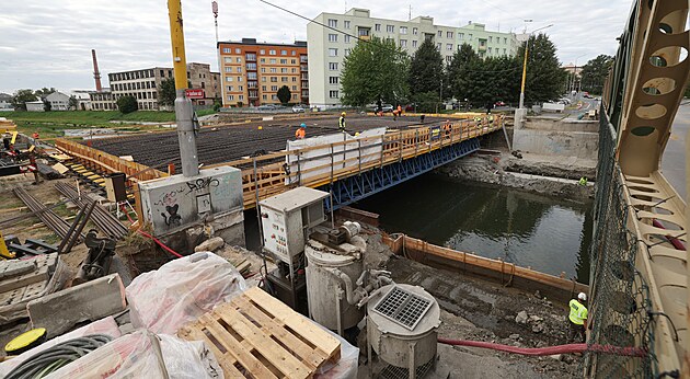 Stavbaři dokončují konstrukci klíčového mostu v opavské Ratibořské ulici, kde povodeň zničila ten původní. (25. srpna 2025)