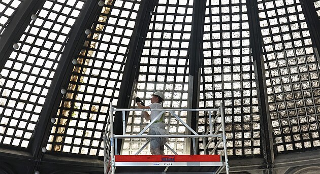 Restaurátoři začali v památkově chráněném opavském obchodním domě Breda s čištěním kopule (21. 8. 2025).