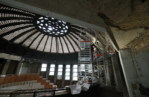 Restaurátoři začali v památkově chráněném opavském obchodním domě Breda s čištěním kopule (21. 8. 2025).