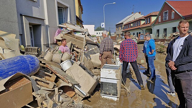 Prezident Petr Pavel si v doprovodu primátora Opavy Tomáše Navrátila a dalších prohlíží vytopené město. Občas něco prohodí s lidmi na místě. (18. září 2024)